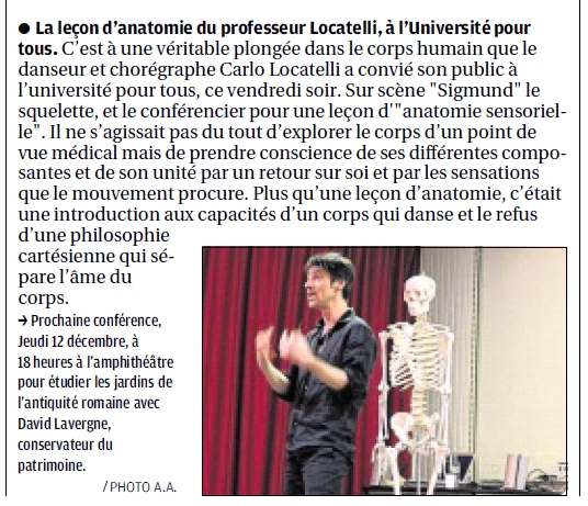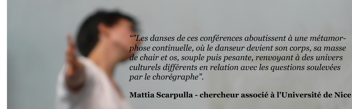 La conférence débute par une proposition chorégraphique (deux danseurs homme/femme) qui pose un questionnement sur la polysémie du corps et sur ses enjeux esthétiques. Puis, la parole ouvre l’espace des idées, pour mieux saisir la valeur du corps anatomique parmi la vaste symbolique du corps. C’est à partir de ce corps matière, physique, que la conférence se construit de façon interactive avec le public. Avec la présence du danseur et le support d’un squelette grandeur nature , l’exposé vise à structurer et à transmettre, de façon vivante et sensorielle, une connaissance du corps humain (organisée selon le principe de la globalité anatomique). Un diaporama d’un corpus de 150 représentations du corps (du IXe au XXe siècle) vient enrichir la conférence. En clôture, une improvisation en duo nous plonge dans une nouvelle vision du corps en mouvement. Avec : Carlo Locatelli – Marina Chojnowki – Claudio Ioanna – et un squelette